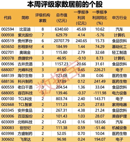 本周,机构关注度最高的是比亚迪,共8家机构参与评级;其次,紫光股份有7家机构关注。贵州茅台、彤程新材则分别获6家和4家机构关注。