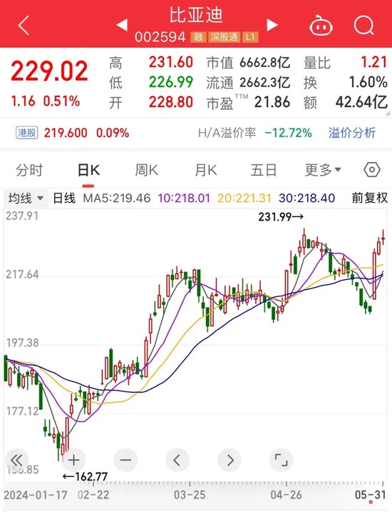 新技术发布后的第二天,比亚迪A股大涨超8%,此后连续两日收涨,最新报收229.02元/股,市值高达6663亿元。
