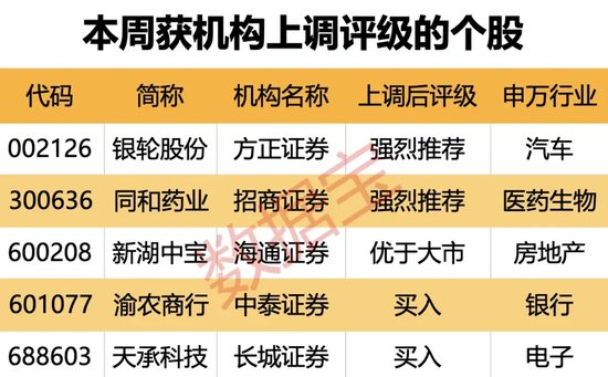 本周5股获得券商机构的青睐,其中银轮股份、同和药业分别获方正证券和招商证券上调至“强烈推荐”评级;新湖中宝则获海通证券上调至“优于大市”评级。