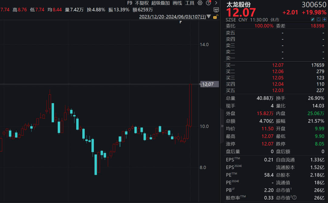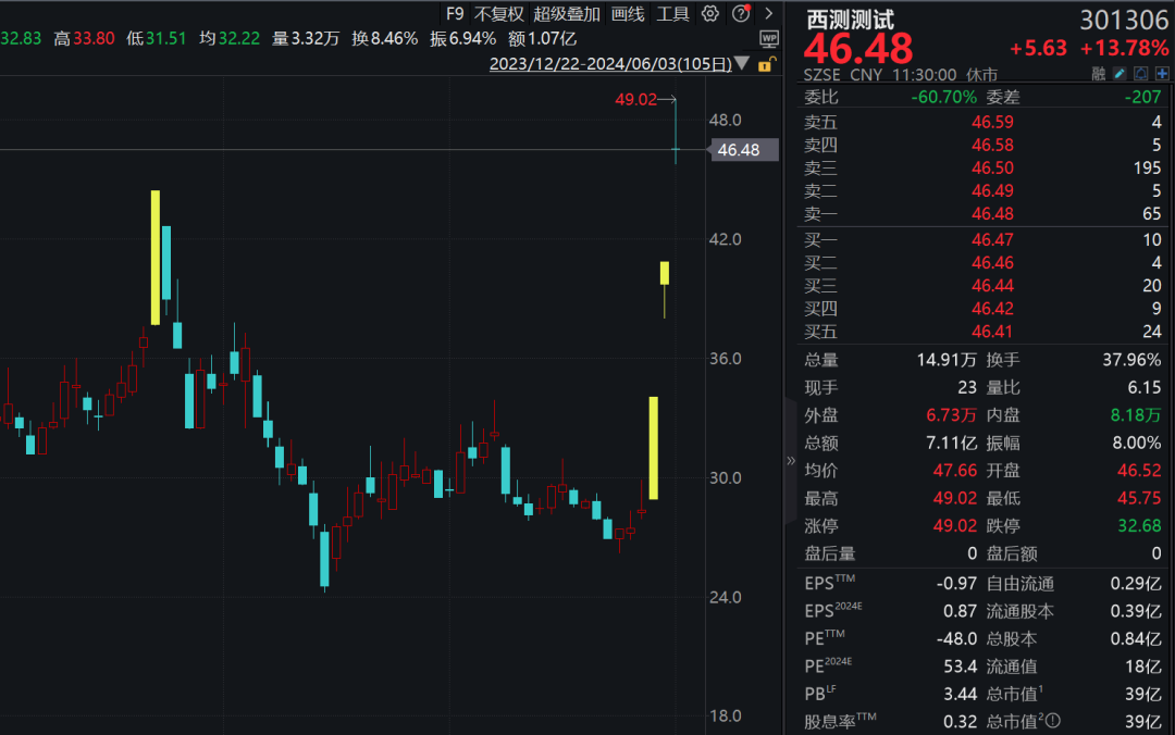 西测测试在连续2个20%涨停后,今日早间盘中再度触及涨停,股价创年内新高,截至发稿涨幅收窄至13.78%,三个交易日累计涨幅约为64%;太龙股份则直线拉升20cm封板,佰维存储、万润科技、好上好等亦强势涨停或涨超10%。