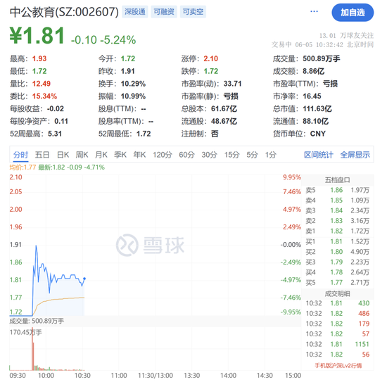 6月5日上午,中公教育(维权)开盘继续跌停,股价最低达到1.72元/股,总市值跌至106亿元,早间卖一封单超230万手。上午大笔资金突然杀入,中公教育直线拉升翻红,截至发稿涨势回落,跌幅仍超5%。