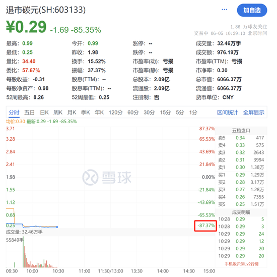 上午开盘后不久,退市园城、退市同达、退市碳元交易触及盘中临时停牌。上交所自9时30分开始暂停其交易,9时40分起恢复交易。截至发稿,退市园城跌幅最高达到98.68%,退市同达跌逾85%,退市碳元跌逾87%。