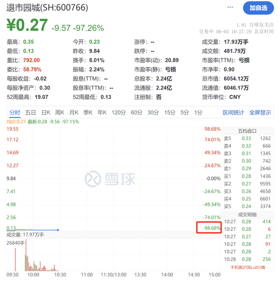 6月5日上午,退市园城、退市碳元(维权)、退市同达三只退市股集体复牌,首日出现无悬念暴跌。