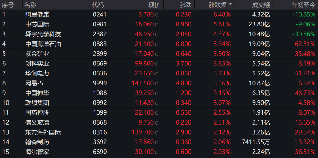 阿里健康涨6.48%,中芯国际涨5.61%,舜宇光学科技涨4.37%,领涨蓝筹。