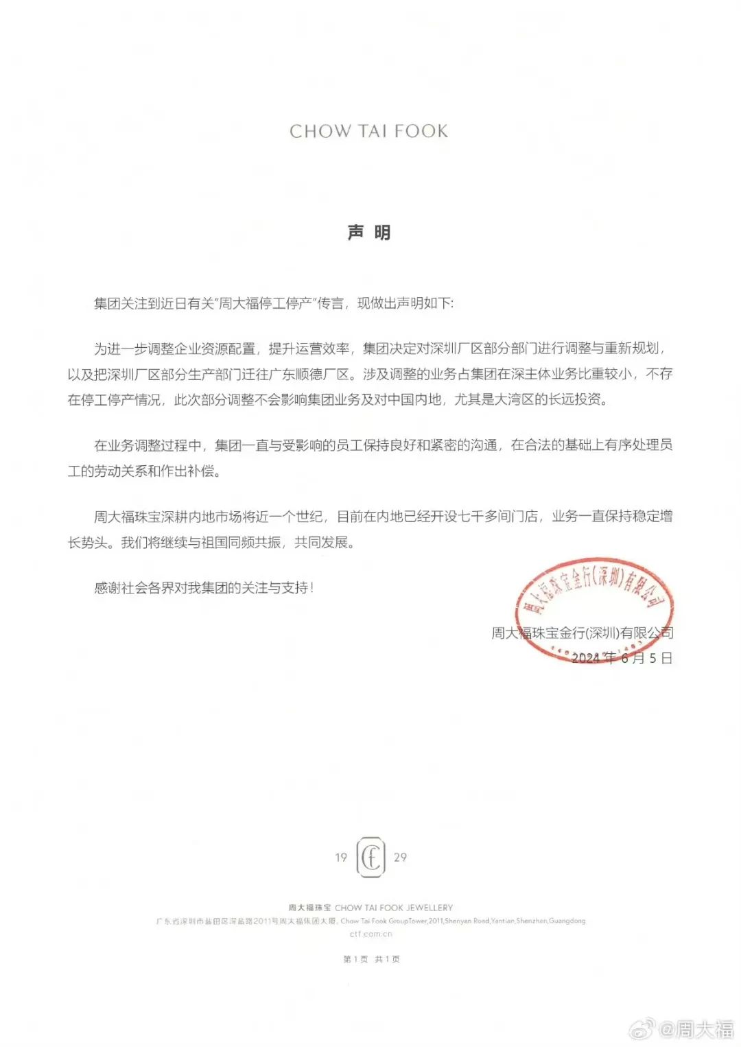 6月5日,周大福发布声明表示,集团关注到近日有关“周大福停工停产”传言。