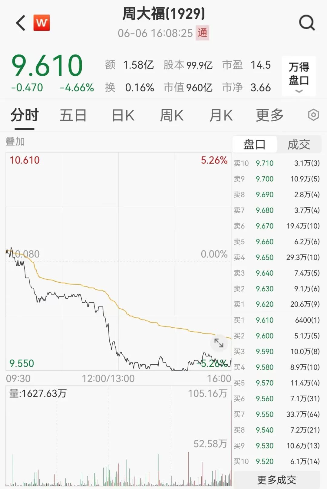 近日,网传周大福深圳工厂停工停产。尽管周大福于6月5日发布声明表示,对深圳厂区部分部门的调整与重新规划不会影响集团业务及对中国内地的长远投资,6月6日周大福股价仍一度大幅下跌5.26%,最终收于9.61港元,跌4.66%。