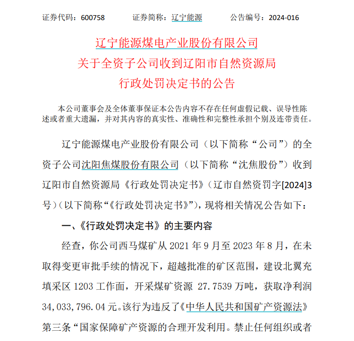 公告显示,辽宁能源的全资子公司沈焦股份收到辽阳市自然资源局《行政处罚决定书》。