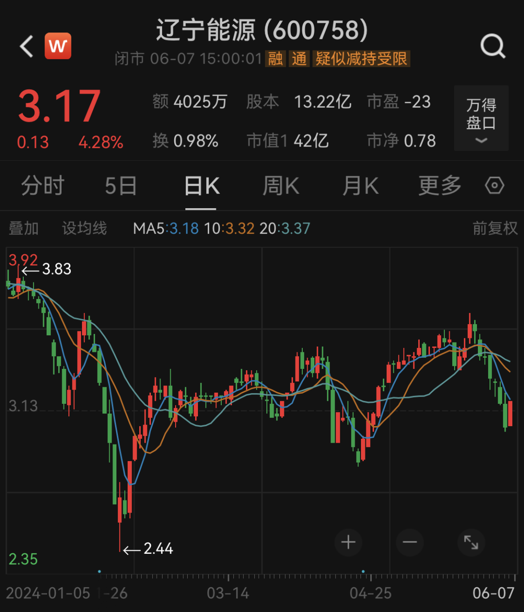 截至6月7日收盘,辽宁能源每股报3.14元,年内下跌超12%。公司最新市值为42亿元。