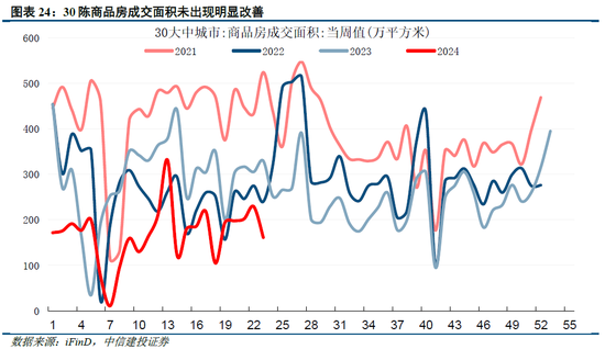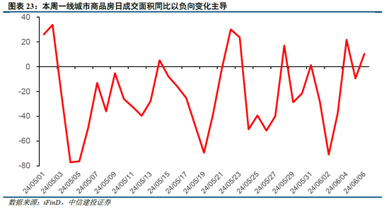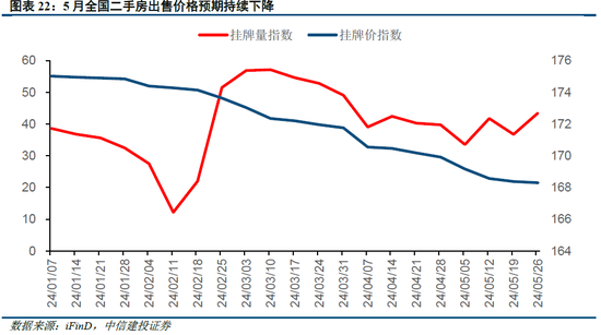 地产交易低迷,政策成效仍待时间检验。从全国二手房市场看,5月二手房挂牌价持续下跌,市场对二手房价格预期不断降低 。与价格的下降相对比,5月挂牌量波动中略有回升,“以价换量”现象依然存在。近日高频数据显示,尽管5月央地地产政策密集出台,上海、广州、深圳地产政策落地,一线城市商品房日成交面积持续大幅下滑,未见政策带来地产交易回温。
