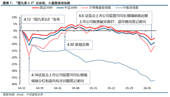 4月12日,国务院印发《关于加强监管防范风险推动资本市场高质量发展的若干意见》,即“国九条3.0”。明确表态畅通“出口关”:进一步严格强制退市标准,进一步畅通多元退市渠道,进一步削减“壳”资源价值。证监会深入贯彻落实上述要求,坚持“两强两严”的基调,结合当前资本市场实际,制定发布了《关于严格执行退市制度的意见》,证券交易所修订完善相关退市规则。新规于4月30日正式实施,至今已有一月有余,新规的效果开始显现。近日ST板块跌幅扩大,小盘股也明显走低。