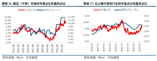 中期来看内需偏弱、结构性景气依赖外需的盈利结构没有改变,红利、出口链的相对收益具备底层逻辑支撑,从估值看也未见明显泡沫化风险。行业/风格轮动源自于不同资产增速的相对变化,对于大多数风格而言,盈利占比(全A)与市值占比(全A)的趋势呈匹配状态。红利和出口链资产占优行情的底层支撑在于内需疲弱背景下,必需品属性品类和外需景气型品类具备相对盈利。22年以来以中信稳定风格指代的红利资产维持较强盈利韧性,占比全A的盈利比重持续上行,带动市值占比的提升;而以工程机械+家电+航海装备+商用车指代的出口链资产则自23年以来实现了盈利占比的明显提升。