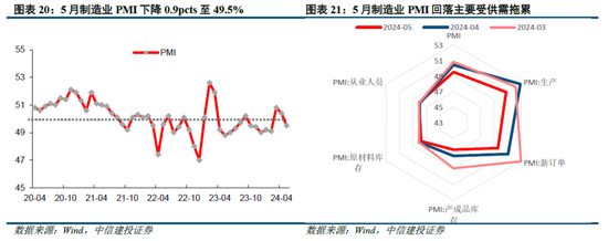 内需回升未见端倪,新增出口需求提示下行信号,补库斜率放缓。根据国家统计局发布数据,5月制造业PMI录得49.5%,较上月下降0.9个pcts;服务业PMI录得50.5%,较上月上升0.2个pcts;建筑业录得54.4%,较上月下降1.9个pcts。从构成PMI的主要分项指标来看,供需下行是导致5月制造业PMI回落的主因。5月生产指数较上月回落1.1个pcts至50.8%,产成品库存指数回落近十月新低至46.5%,表明企业库存仍在去化;新订单指数回落0.5个pcts至荣枯线以下,主要受出口端回落影响,5月新出口订单指数下降2.3个pcts至48.3%。新增需求再度转弱,叠加外部环境日益严峻,消费内需持续偏弱,预计当前企业补库意愿不强,新一轮补库周期难以顺畅展开。