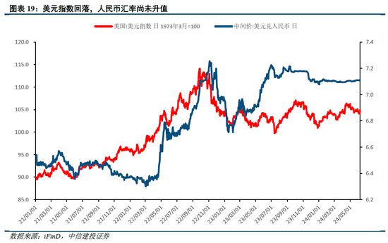 此外,在意外强劲的美国5月非农就业报告出炉后,市场不再预估美国于12月前有百分百机会降息,市场可能会将目光锁定在周三的联邦公开市场委员会决定上,这是一次伴随更新经济预测和新的点阵图的重要会议,将对下半年的政策路径带来指引,同样需要密切关注。当下,美元指数已经有所回落,但人民币汇率仍未出现显著回升。