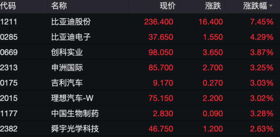 恒生指数成份股中,比亚迪股份、比亚迪电子、创科实业、申洲国际等领涨。