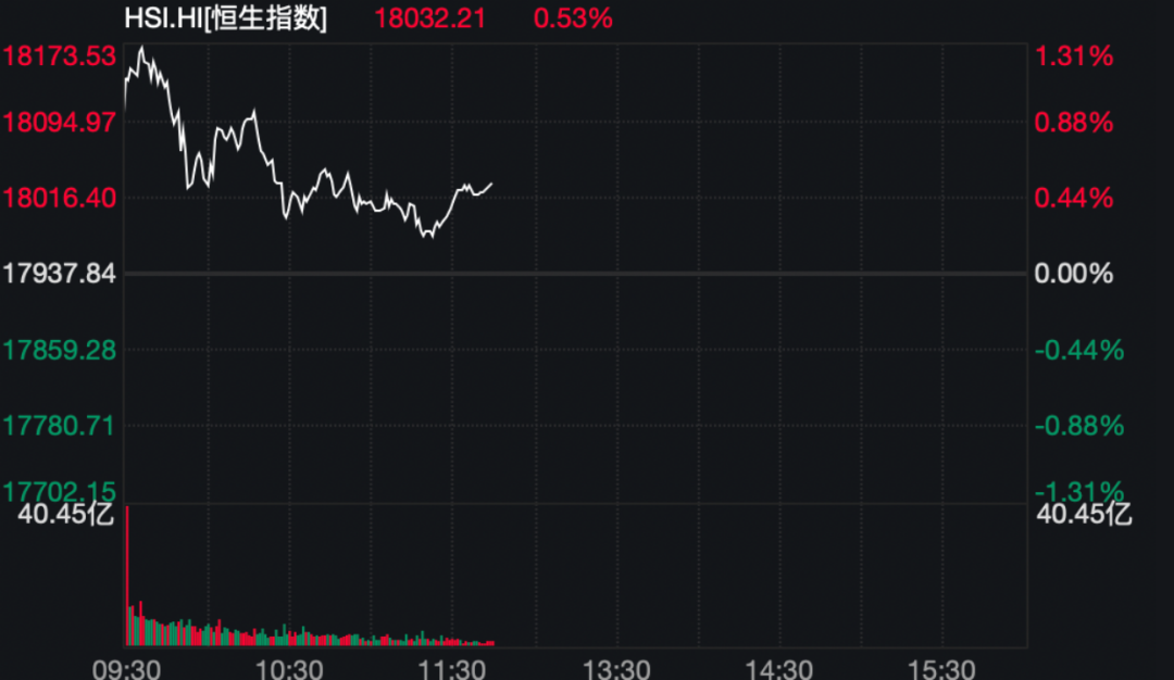 港股市场上午大幅走高后收窄涨幅。