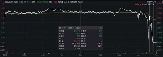 今日,该股小幅高开后迅速冲高,盘中最高涨至0.99元/股,但始终未能冲上1元大关。14:00以后,*ST巴安涨幅逐步回落,在临近收盘时,7分钟时间里更是暴跌超25%,最终以“20cm”跌停收盘,股价报0.68元/股。