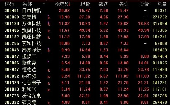 消费电子概念今日再度走强,截至收盘,田中精机、杰美特“20cm”涨停,万祥科技、致尚科技涨近12%,宏和科技、泰嘉股份、东晶电子等涨停,工业富联涨约4%。