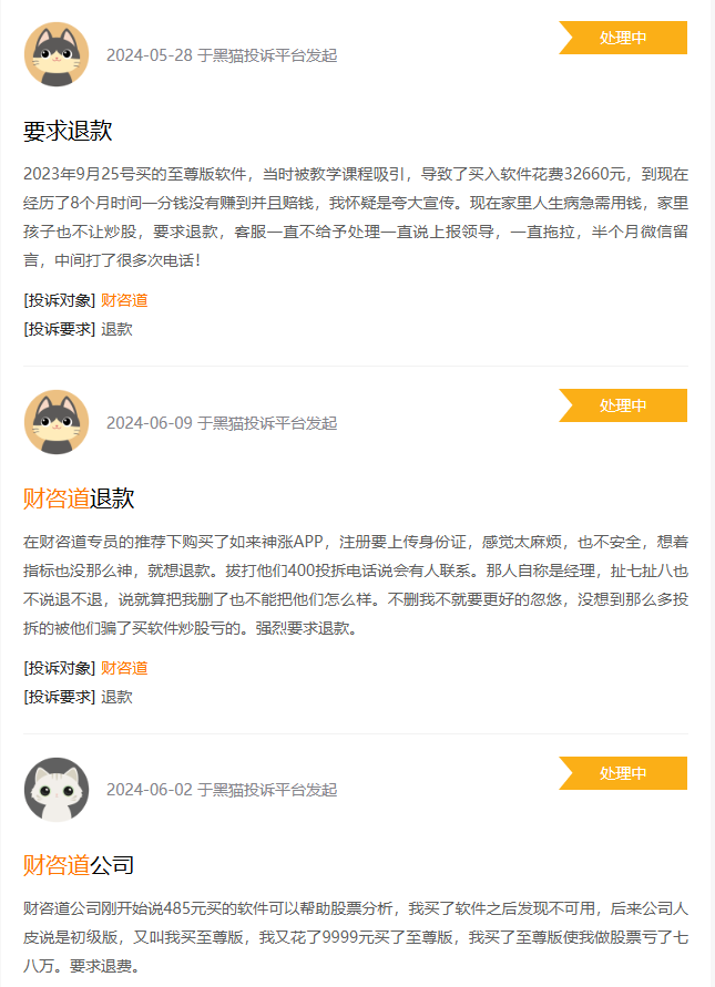 近期,“黑猫投诉 【下载黑猫投诉客户端】”上有多名投资者投诉财咨道,要求退款。从投诉内容看,主要涉及购买软件后炒股亏损、夸大宣传等问题。