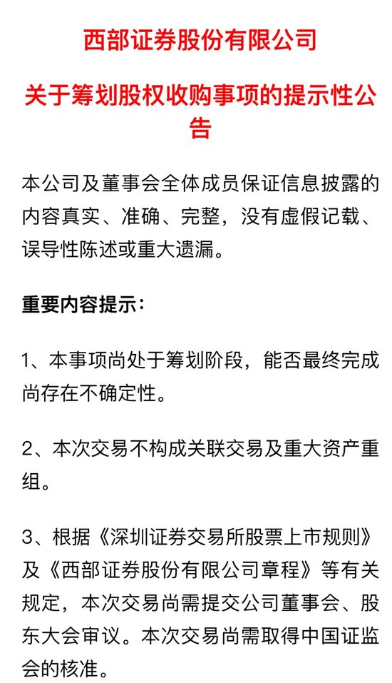 6月21日早间,西部证券发布公告称,公司基于自身发展需要,正在筹划以支付现金方式收购国融证券股份有限公司控股权事项,具体收购股份比例以最终签订的股份转让协议为准。