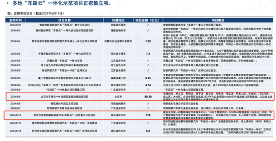 不仅如此,近期各地政策频发,多地“车路云”一体化示范项目密集立项,上周末武汉发布170亿的招标项目也刺激了市场。