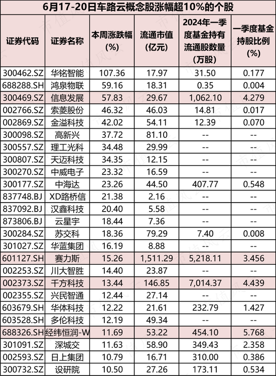 整体看,车路云概念股本周前四天涨幅超10%的个股有25只,多数来自于计算机板块,而且多为小票,除赛力斯外流通市值均不超过百亿。另外,这25只个股中,有14只公募基金持股。