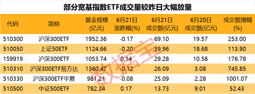 据证券时报·数据宝统计,今日大幅放量的宽基ETF主要有6只。其中,沪深300ETF华夏今日收盘下跌0.08%,全天成交25.09亿元,成交量较昨日放大10倍;沪深300ETF易方达、沪深300ETF、沪深300ETF和上证50ETF今日成交量分别较昨日放大7.46倍、2.53倍、1.77倍、1.14倍。