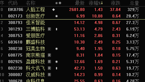 盘面上,脑机接口指数逆市大涨,涨幅2.61%。成份股中,创新医疗涨停;翔宇医疗大涨8.67%;诚益通、佳禾智能、三博脑科等多股跟涨,幅度均超过4%。