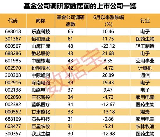 15家公司获超30家基金公司调研,其中4家公司来自电子行业。