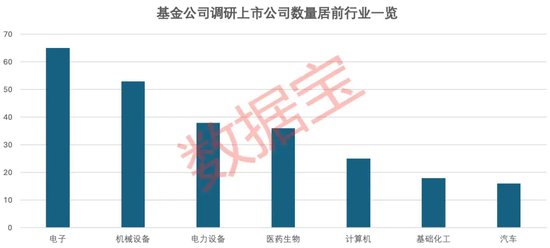 据数据宝统计,从行业来看,电子、机械设备、电力设备、医药生物和计算机五大行业的基金公司关注度较高,均有超20家上市公司获基金公司调研。电子行业获基金公司调研的公司数量达65家,是最受基金公司关注的行业。