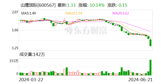 行情数据显示,6月21日山鹰国际A股开盘后不久“闪崩”,截至当天收盘,封住跌停,股价报1.33元。