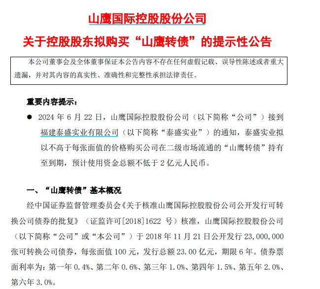 公告称,基于对公司未来发展前景的信心以及对公司内在价值的认可,结合近期公司可转债及股票二级市场表现,为切实保护可转债投资人和公司全体股东的利益,维护可转债市场价值,稳定市场预期,控股股东泰盛实业拟以不高于每张面值的价格购买公司在二级市场流通的“山鹰转债”持有至到期,预计使用资金总额不低于2亿元人民币。