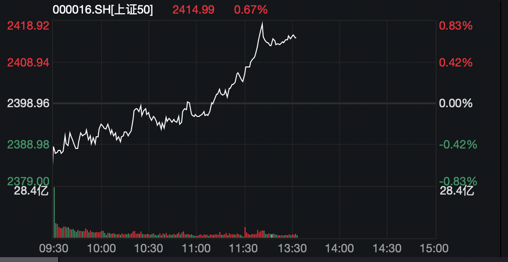 上证50指数盘中也逐渐收窄跌幅,临近午盘翻红,午后持续走高。