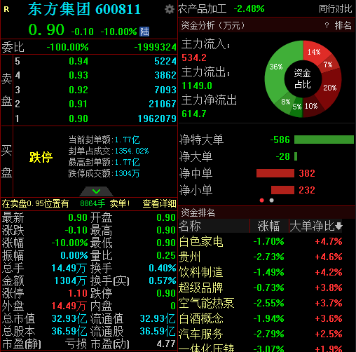 东方集团一字跌停,截至午间收盘,该股报0.9元。近日,该股股价连续下挫,录得连续2个交易日跌停,20个交易日内累计跌超44%。