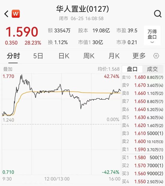 6月25日,港股“大刘”刘銮雄旗下华人置业大涨一度飙涨近40%,收涨超28%,股价创2023年11月以来新高。