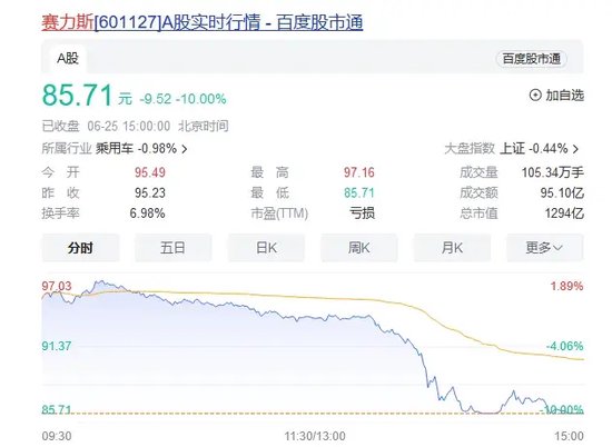 而赛力斯午后却跳水跌停,收盘报85.71元,全日成交逾95亿元,最新市值1294亿元。