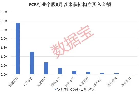 科翔股份6月以来获机构净买入2.88亿元,位居首位。公司PCB产品包括双层板、多层板、HDI板、厚铜板、高速板等多种产品,重点应用于汽车电子、消费电子、通讯设备、计算机、医疗器械等领域。据公司投资者关系活动记录表,公司及子公司4月和5月的订单呈现回升趋势,产能利用率有所提高。