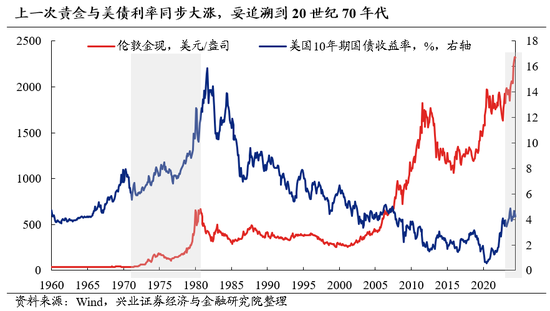 并且,本轮黄金上涨的特殊之处在于,金价大涨的同时,还伴随着美债利率的大幅抬升。美债利率作为持有黄金的机会成本,通常情况下与金价呈明显的负相关。而本轮黄金牛市的特殊之处在于,美债利率大幅上行、持有黄金的成本持续抬升的同时,黄金价格却仍大幅上涨并创出历史新高。回顾历史,上一次出现黄金与美债利率同步大涨的情况,还要追溯到20世纪70年代。