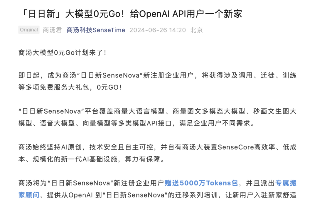 6月26日,商汤科技于官方微信公众号发文表示,“即日起,成为商汤“日日新SenseNova”新注册企业用户,将获得涉及调用、迁徙、训练等多项免费服务大礼包,0元GO!”