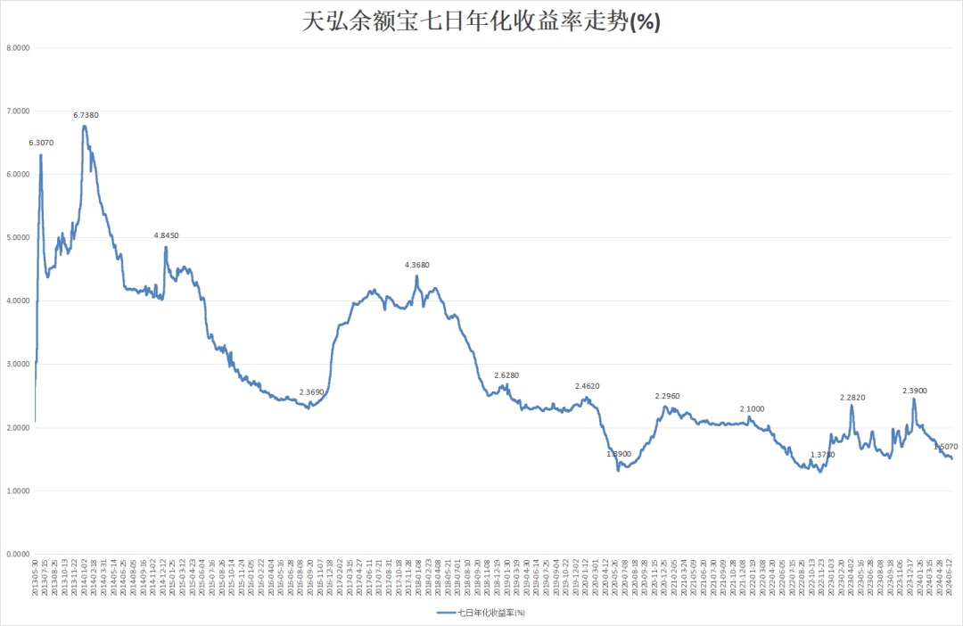 余额宝推出之初就规模迅速增长,是受当时货币基金相对较高收益率的支撑。Wind数据显示,天弘余额宝2013年推出时,收益率一度超过6.7%。不过,从2017年年末开始,余额宝收益率一路下滑,陆续跌破4%、3%、2.5%、2%等关口,尤其是在2020年4月初至11月末以及2022年2月末至2023年3月末这两个时间段,7日年化收益率基本处于2%以下,2022年11月中旬最低甚至达到1.292%的收益率水平,此次是去年年末经历一轮回归“2%”区间之后,再一次进入“1%”区间。