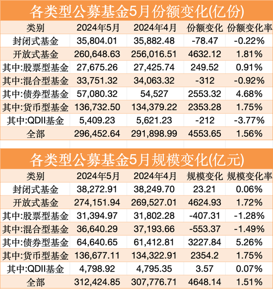 相比4月份,公募基金5月份的单月规模增加4648.14亿元,环比增长1.51%。5月末公募基金整体份额达到29.65万亿份,环比增长1.56%,规模增长速度和份额增幅基本持平。