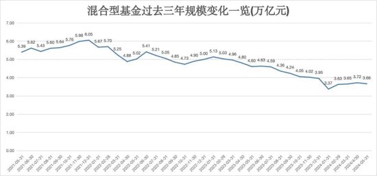 混合型基金依旧是公募基金规模“失血”的主阵营,截至5月底,混合基金最新规模为3.66万亿元,最新份额为3.38万亿份,环比分别下跌1.49%、0.92%。