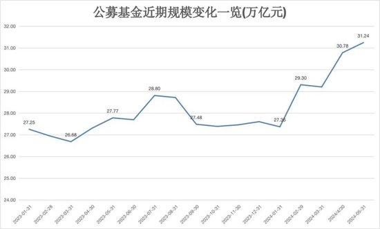 刚刚,中国基金业协会发布最新一期公募基金市场数据。截至今年5月底,公募基金总规模又上一个台阶,达到31.24万亿元,相比4月份增长4648.14亿元。这是公募基金总规模首次突破31万亿元。