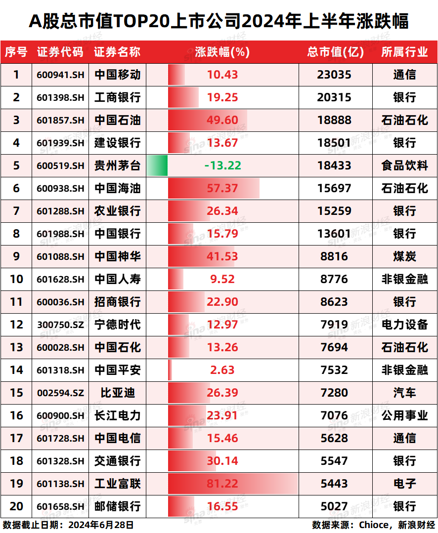 7月1日消息,最新盘点A股总市值TOP20上市公司上半年股价表现: