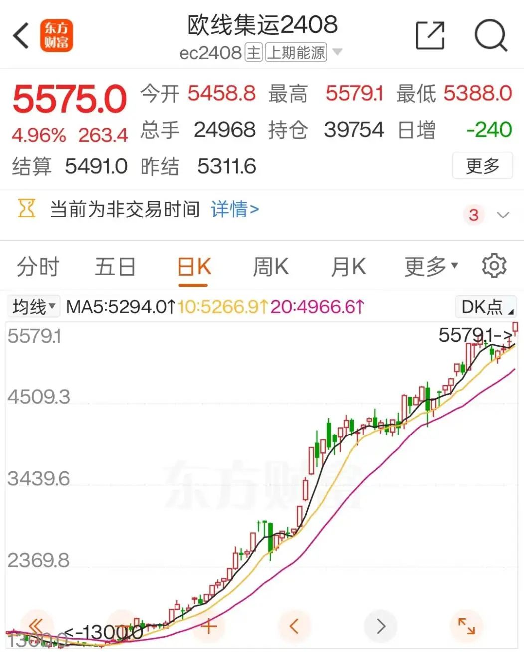 就在7月2日,集运欧线主力合约(ec2408)达到5575点,日内涨近5%,创上市来新高。而一众航运上市公司股价在午后迅速拉涨,其中凤凰航运短时间内涨停,国航远洋、宁波海运等公司股价也大幅跟涨。