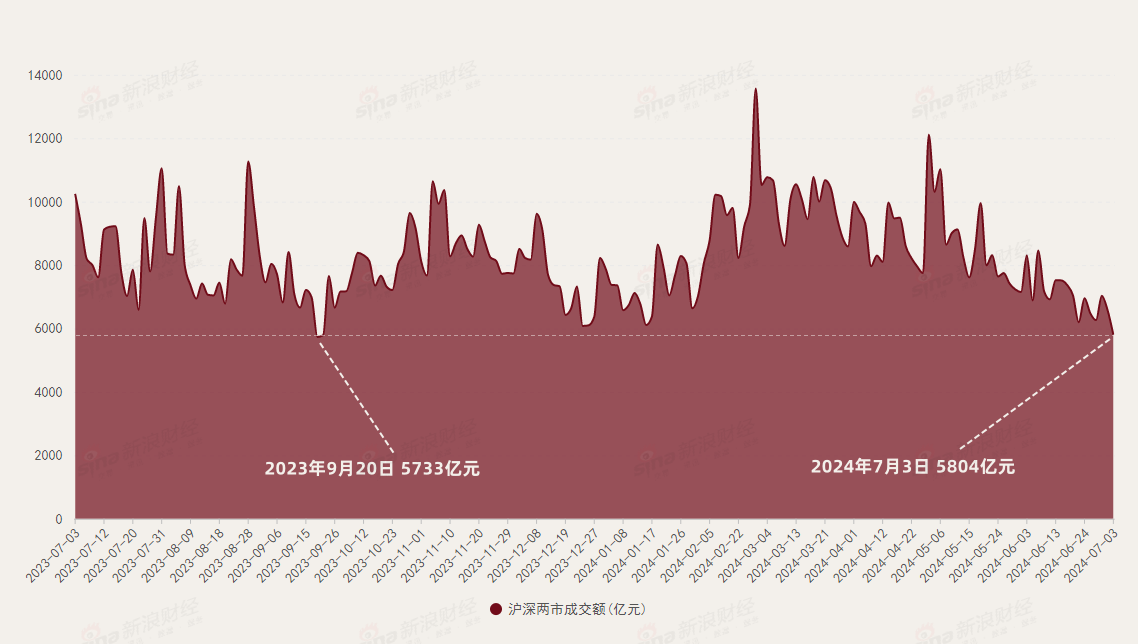 7月3日,A股市场全天震荡调整,三大指数均小幅下跌。沪深两市今日成交额5803亿,较上个交易日缩量644亿,成交额不足6000亿,创下近10个月来新低。