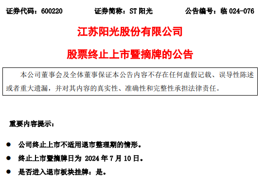 7月3日,ST阳光收到上交所出具的自律监管决定书《关于江苏阳光股份有限公司股票终止上市的决定》。