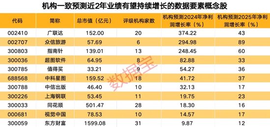 12只数据要素相关概念股获超5家机构评级,其中11股机构一致预测今年、明年全年业绩有望持续增长,其中广联达、众信旅游、指南针的机构一致预测2024年净利润增幅均超200%。
