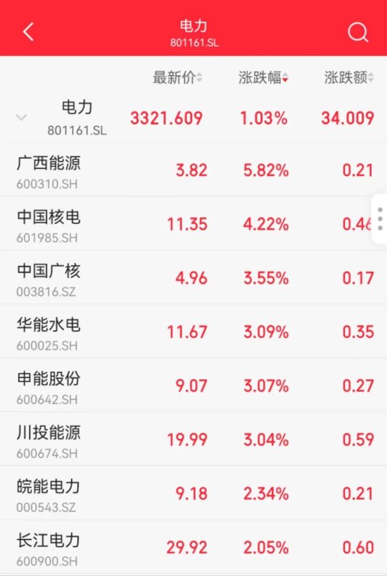 电力板块部分高收,中国广核盘中涨超5%,股价创历史新高,华能水电、川投能源亦创新高。截至收盘,广西能源(维权)涨近6%,中国核电、申能股份、皖能电力、长江电力等跟涨。