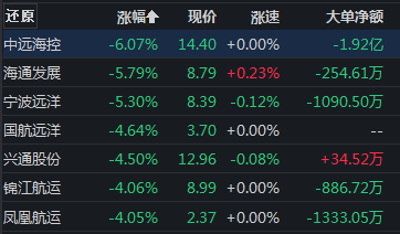 航运股低迷,中远海控、海通发展、宁波远洋跌超5%。