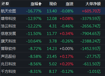 数据要素概念股走弱,航天宏图跌超15%,雄帝科技、旗天科技、信息发展、浩云科技跌超10%。